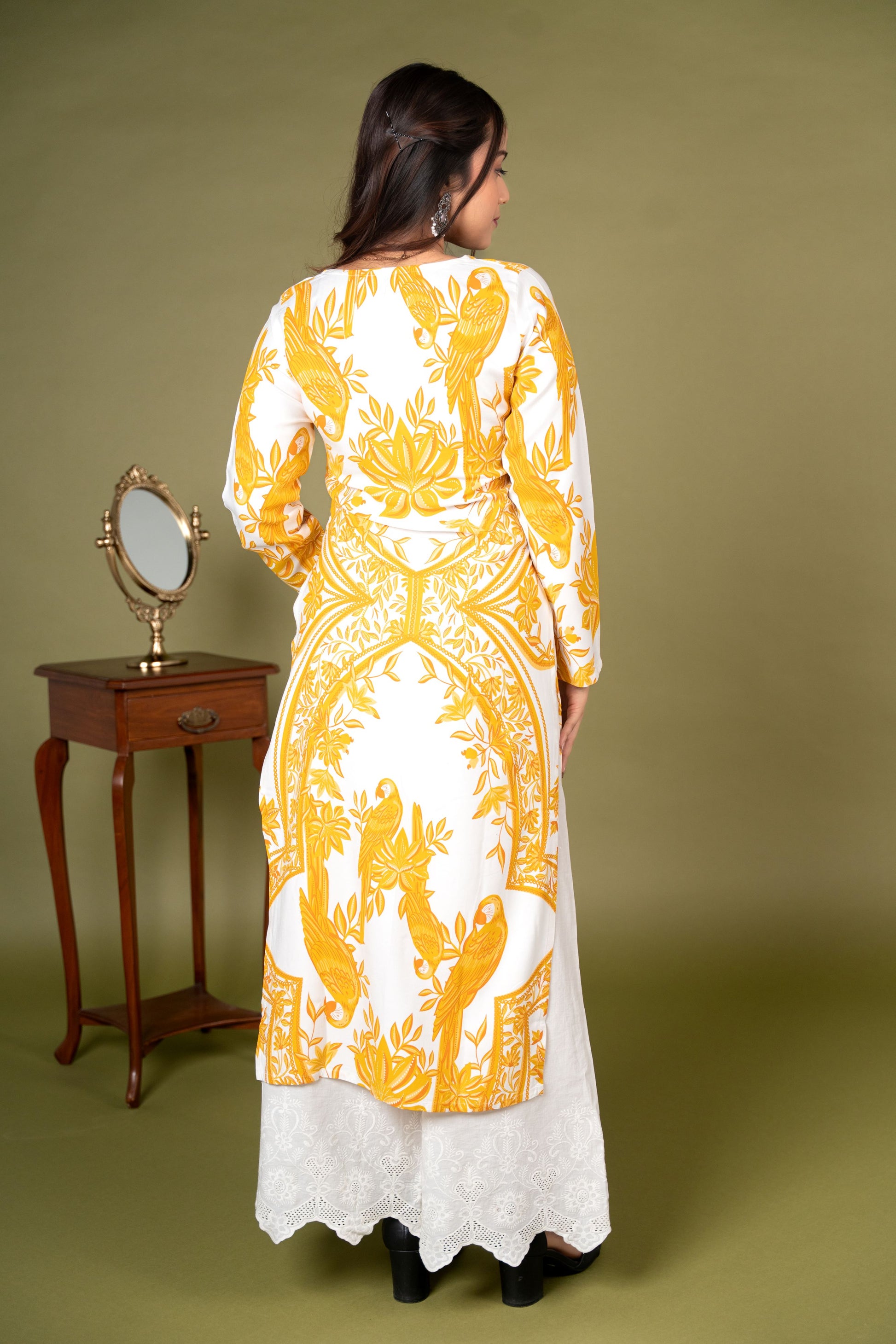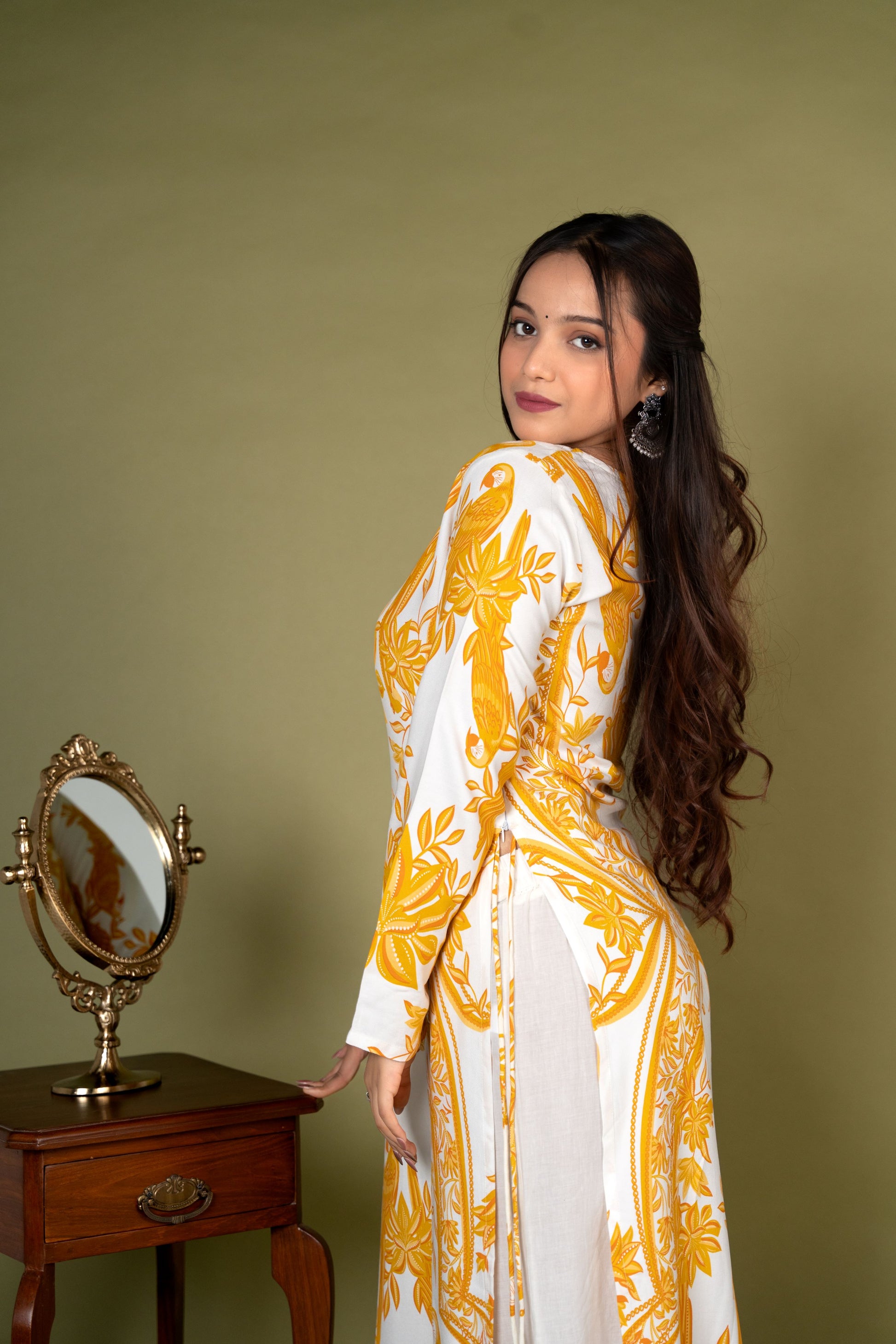 The kurta features a graceful sweetheart neckline that adds a soft and feminine charm to the design. It comes in a mustard-yellow and white palette with bold floral and paisley-inspired patterns that create a vibrant and elegant appeal. The long sleeves carry the same print and give the outfit a refined finish while ensuring comfort and sophistication. The design is flattering and versatile which makes it suitable for both casual outings and stylish daywear.